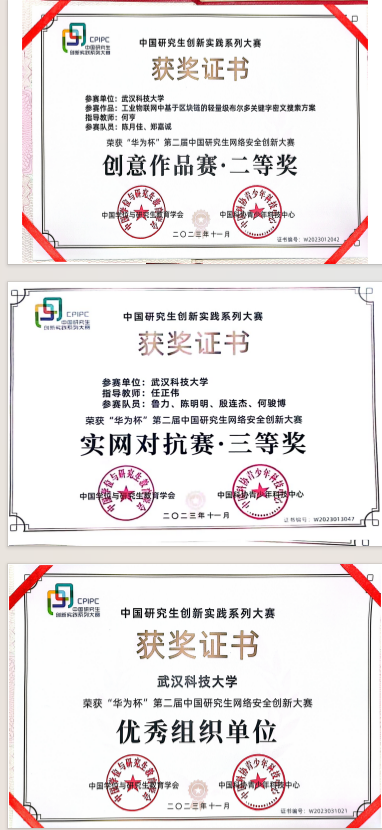 的陈月佳、郑嘉诚等2名研究生组成,指导教师为何亨。该团队为了解决工业物联网中密文搜索领域存在的难题,提出了一种基于区块链的轻量级布尔多关键字密文搜索方案,该方案对于工业物联网中工业数据安全、高效共享具有重要意义与实用价值。获得全国三等奖的团队由17short