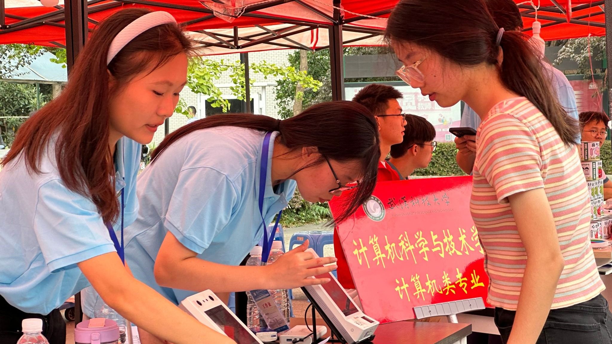 在本科生迎新现场,各学生社团竞相绽放光彩,为新生及家长呈现了一场视觉与心灵的双重盛宴。微软俱乐部以科技感爆棚的车辆展示引人驻足,完美融合科技与教育的魅力;攀登者社团则以户外运动的激情,激励新生勇于探索、攀登新高;机器人俱乐部的精彩表演,展现了科技的无限可能与趣味;蔻丁俱乐部的互动小游戏与刮刮乐活动,不仅增进了新生间的了解与友谊,更为迎新活动增添了无限乐趣。2024级本科生辅导员闫昌昊表示:“这些卡片上不仅承载着学院对新生的美好祝愿,更寄托了对他们未来大学生活的殷切期望。”