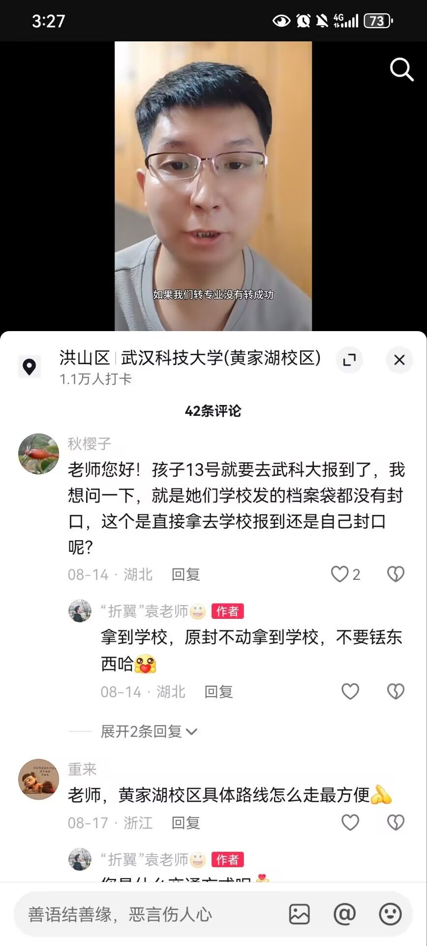 视频发布后,许多家长和学生在评论区留言提问就业前景、转专业、考研等问题,袁鑫都一一耐心解答。一些家⻓询问在读学⽣计算机专业分流情况,袁鑫从专业本身、就业前景、考研意义多个⽅⾯分析此专业并且对学⽣给予⿎励肯定,并认真地说:“无论选择哪个专业方向,都需要他在大学期间努力学习专业知识,积极参加实践活动,不断提高自己的综合素质。”他基于自身经验,给予学生实用性的建议,为他们拨开迷雾,找寻方向。