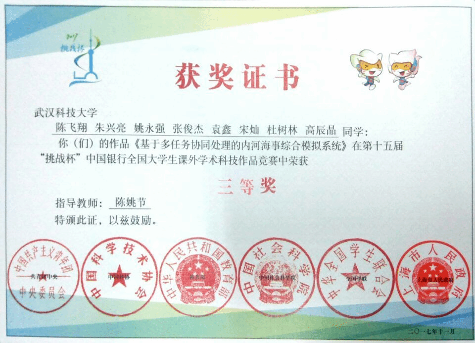 实验室成就:实验室除了正常实验课程外,还指导大学生参与嵌入式、挑战杯等多项比赛累计获奖超30项,其中挑战杯比赛获两次全国二等奖、两次全国三等奖。承担一项军委重点研发项目,一项产学研协同育人项目以及近30项校企合作项目,累计科研经费1300万。获湖北省科技进步奖两项,湖北省教学成果奖一项,17short